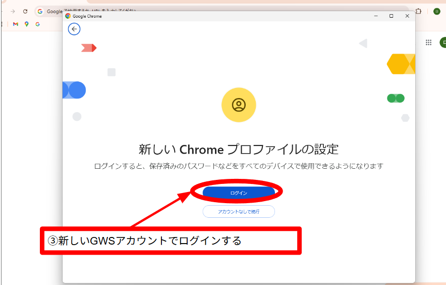 新しいプロファイル用のログイン画面が表示されるので、新しいGWSのユーザー名、パスワードを使いログインします。ログイン後は流れに従って、ご利用に合わせて選択してください。