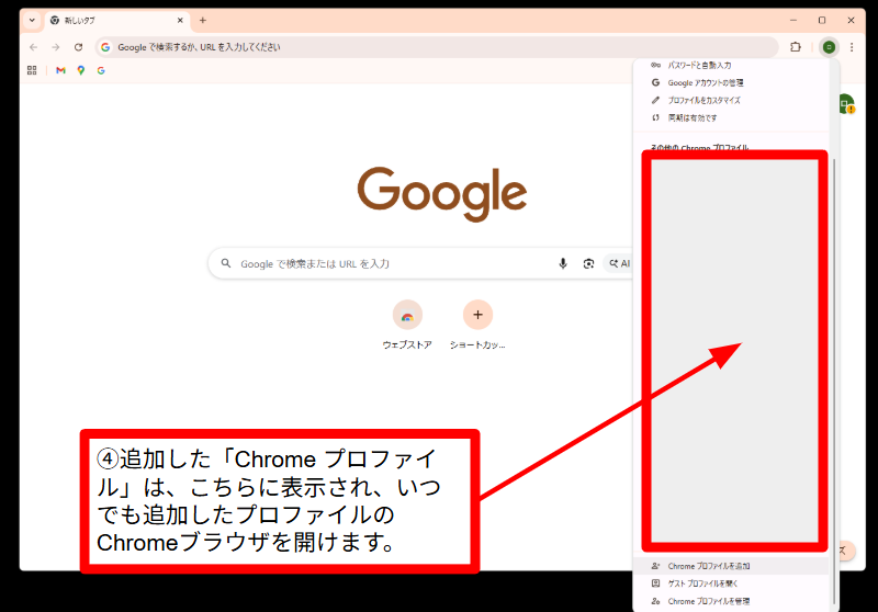 追加した「Chrome プロファイル」は、①で開いたボックス内に表示され、いつでも追加したプロファイルのChromeブラウザを開けます。