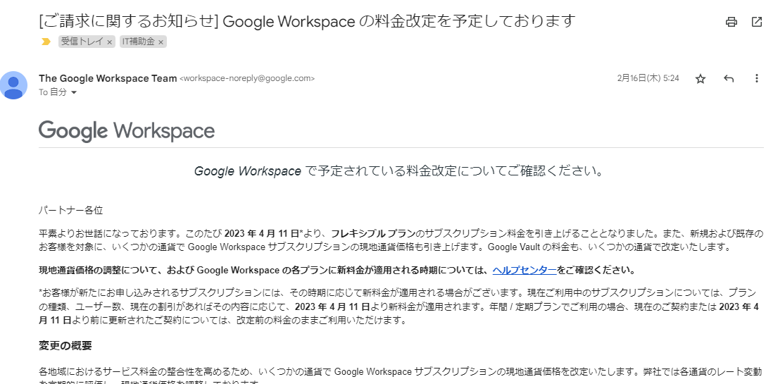 2023年のGoogle Workspaceの料金改定(値上げ)ですが、通知があった時点では円での料金が決まっておりませんでした。