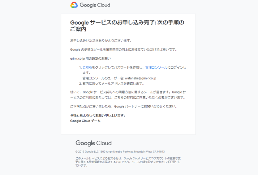 Gsuiteをこちらで開設後に最初に行っていただく作業は、マスターアカウントのパスワードの設定と、サービス契約への同意の2つになります。
