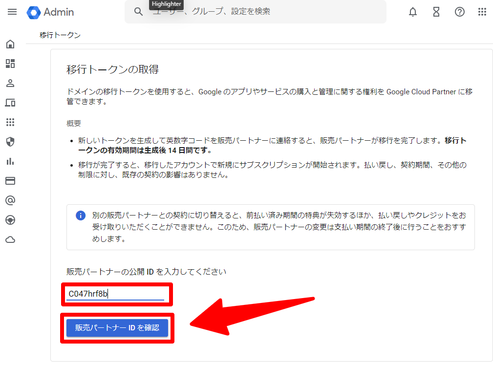 販売パートナーのドメイン、会社名が間違いなければ「移行トークン」を生成をクリック