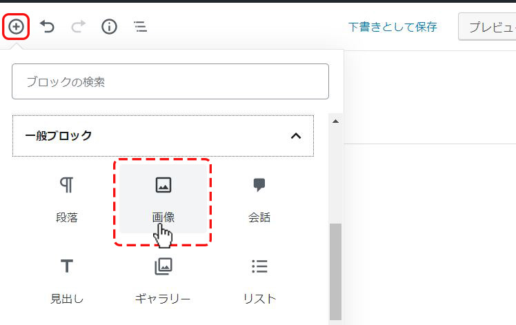 一般ブロックカテゴリーの「画像」を選択すると編集画面に画像ブロックが追加されました。